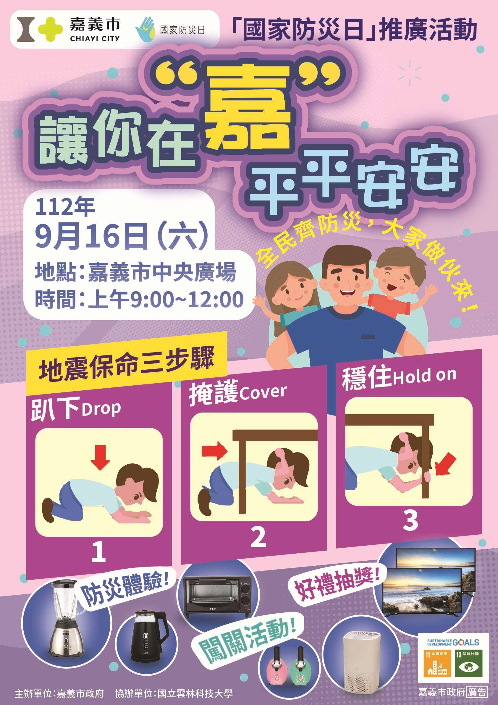 活動訂於本(112)年9月16日(週六)9時至12時假中央廣場(文化路與民權路口)辦理宣導活動,透過現場各類攤位宣導資訊及互動體驗,喚起市民及社會各界重視自助、互助的重要性,達到精進全民防災之目標。