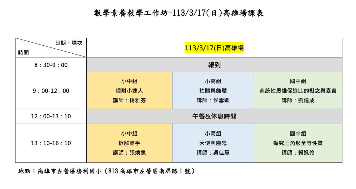 時間:113年3月17日(星期日)上午9時至下午4時10分,課表請詳如附件。